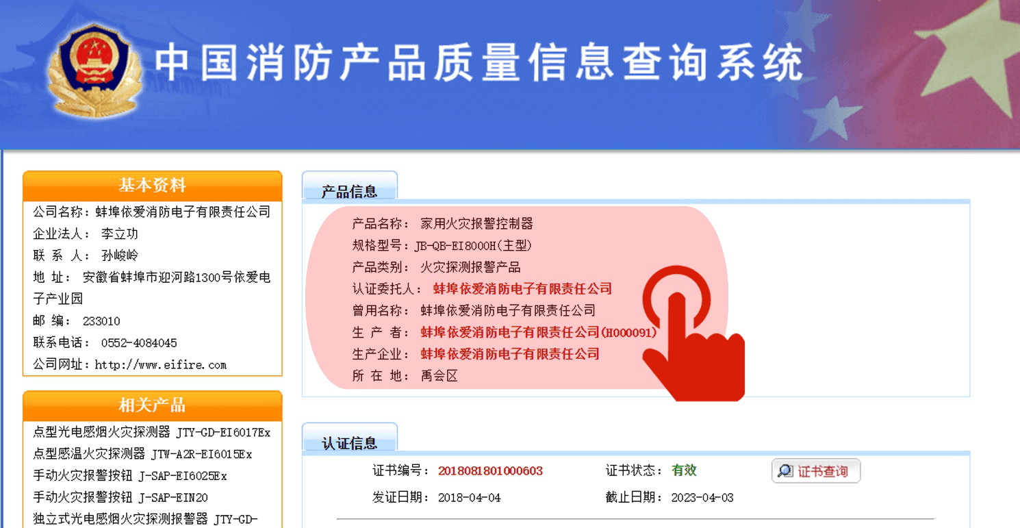 Klik pada produk yang relevan untuk memeriksa sertifikat 3C terbaru dan data laporan inspeksi, seperti klik "Home Fire Alarm Controller".