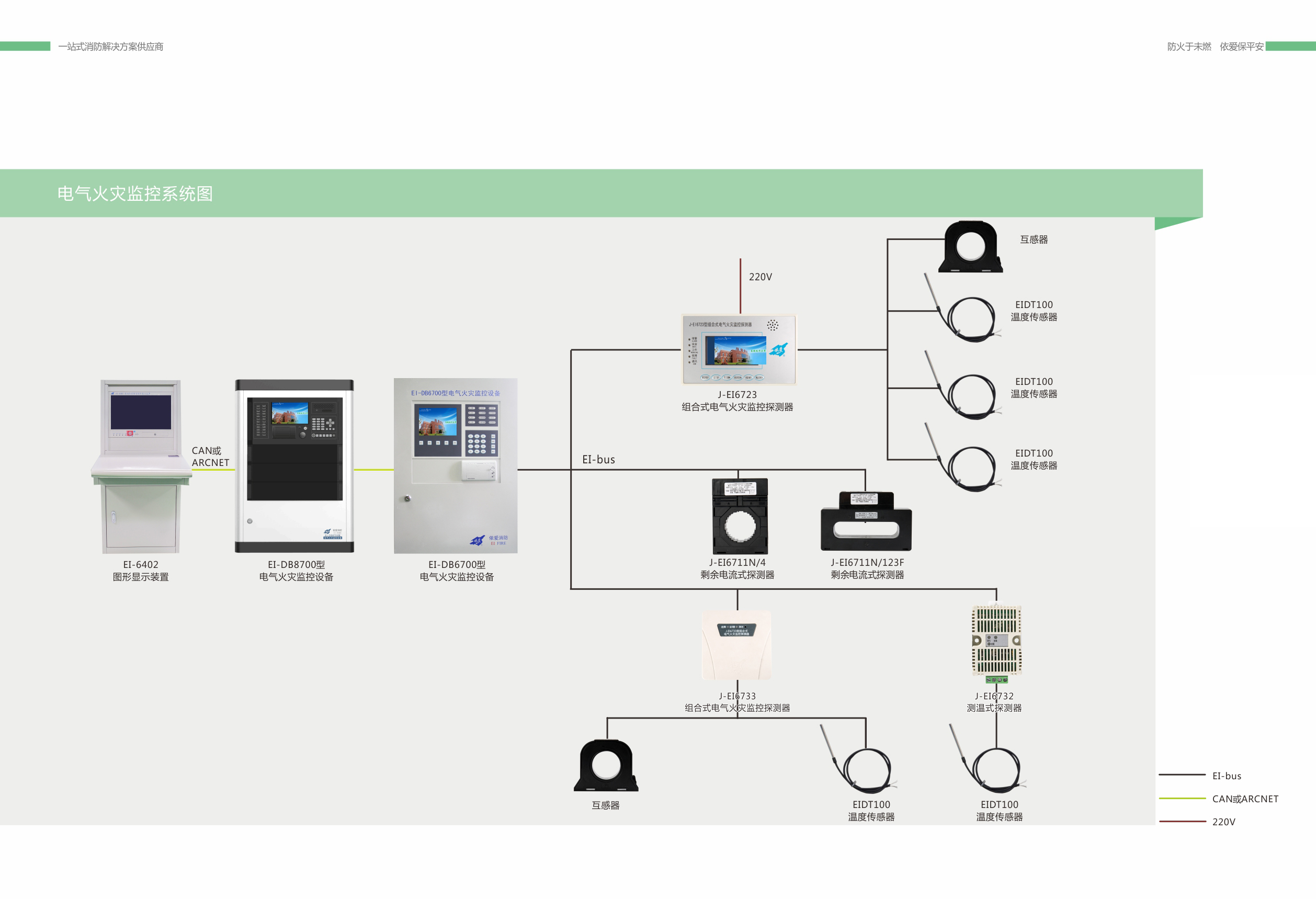 EI 系列電氣火災(zāi)監(jiān)控系統(tǒng)應(yīng)包括電氣火災(zāi)監(jiān)控設(shè)備、剩余電流探測(cè)器(電流互感器)、測(cè)溫式探測(cè)器(傳感器)等產(chǎn)品。